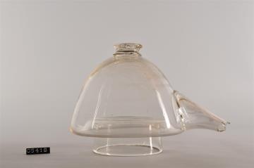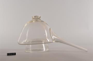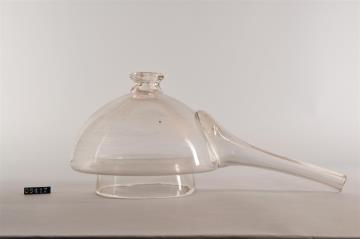 Alambic oder Alembik auch Alambik, Alambique, Alembic, Alembicus oder Destillierhelm oder Brennhut, in der Alchemie auch Caput Mauri, Capitellum oder Galea genannt, aus farblosem Glas ohne Einfüllstutzen, mit aufgeschmolzenem Glasposten (als Griff?) mit aufgelegtem Faden. Aufgesetztes Ablaufrohr, teilweise abgeschlagen. Im Alembic kondensierten die aufsteigenden Dämpfe, wurden abgekühlt und liefen über das Ablaufrohr in ein Auffanggefäß (Fürsetzglas).