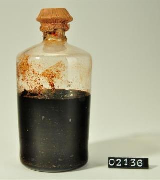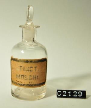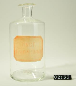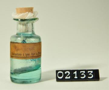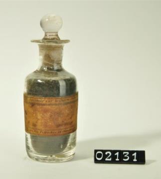 Runde, farblose Enghalsflasche mit eingeschliffenem Griffstopfen (kugelförmiger Massivstopfen). Leicht hochgestochener Boden mit rundem Hefteisenabriss. Ausladender, flacher Mündungsrand. Etikettiert