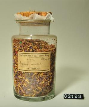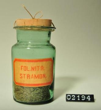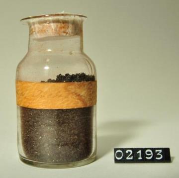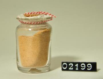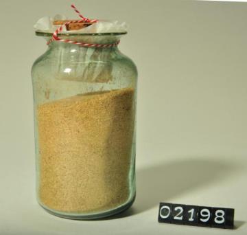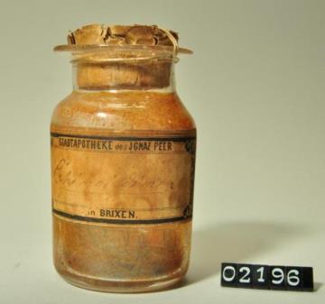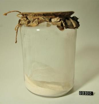 Rundes, farbloses Pulverglas mit Korkstopfen. Boden mit Hefteisenabriss. Ausgebogener Mündungsrand. Etikettiert