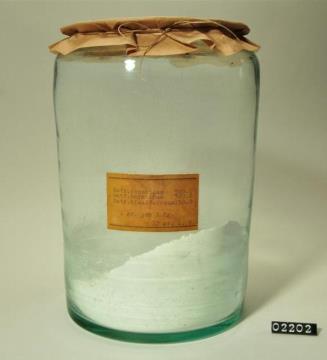 Rundes, farbloses Pulverglas mit Korkstopfen. Boden leicht hochgestochen mit Hefteisenabriss. Ausgebogener, ausladender Mündungsrand. Etikettiert