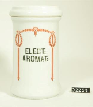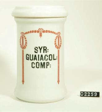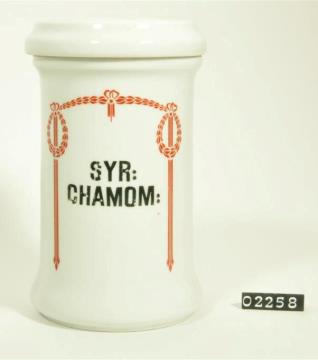Zylinderförmiger Porzellantiegel mit Stülpdeckelrand, geschweiftem Rand und geschweiftem Fuß. Stülpdeckel mit Kehlung. Standring. Standboden plan. Jugendstilähnliche, rotbraune Randdekoration (Blattgirlande mit Bändern). Eingebrannte schwarze, verwaschene Signatur:Syr(upus):Chamom(illae):. Enthielt Kamillenblütensirup.