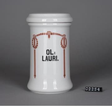 Zylinderförmiger Porzellantiegel mit Stülpdeckelrand, geschweiftem Rand und geschweiftem Fuß. Stülpdeckel mit Kehlung. Standring. Standboden plan. Jugendstilähnliche, rotbraune Randdekoration (Blattgirlande mit Bändern). Eingebrannte schwarze Signatur Ol(eum): Lauri. Enthält Lorbeeröl.