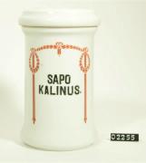 Zylinderförmiger Porzellantiegel mit Stülpdeckelrand, geschweiftem Rand und geschweiftem Fuß. Stülpdeckel mit Kehlung. Standring. Standboden plan. Jugendstilähnliche, rotbraune Randdekoration (Blattgirlande mit Bändern). Eingebrannte schwarze Signatur: Sapo kalinus. Enthielt Schmierseife.