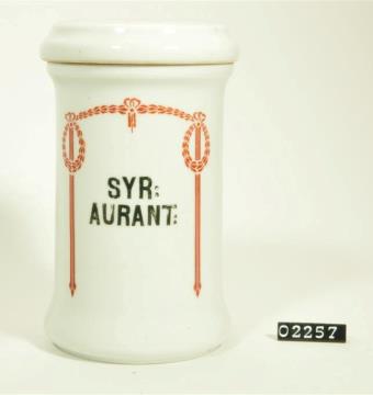 Zylinderförmiger Porzellantiegel mit Stülpdeckelrand, geschweiftem Rand und geschweiftem Fuß. Stülpdeckel mit Kehlung. Standring. Standboden plan. Jugendstilähnliche, rotbraune Randdekoration (Blattgirlande mit Bändern). Eingebrannte schwarze SignaturSyr(upus: Aurant(ii):. Enthielt Orangensirup.