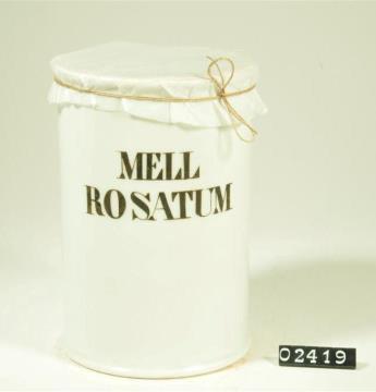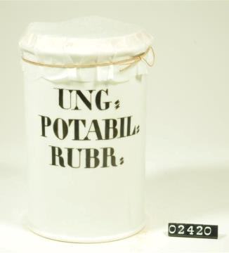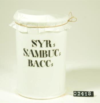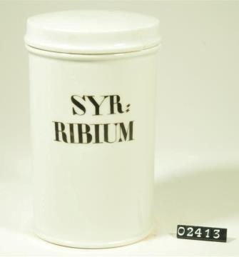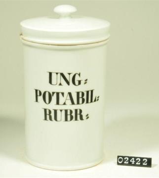 Zylinderförmiger Porzellantiegel mit Stülpdeckelrand, wenig ausladendem, schmalem, gerundetem Rand und Fuß. Tektur. Standboden nach innen eingezogen. Eingebrannte schwarze Signatur
