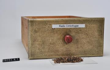 Schublade für Kräuterdrogen aus Nadelholz mit rotem Knauf. Vorderseite angeleimt, grau-braun maserierend angemalen. Die Schubladenseitenteile haben eine Schwalbenschwanzverbindung. Boden angeleimt und mit Holznägeln gesichert. Signatur mit Dymo-Band. Enthält Schwarze Schlangenwurzel, geschnitten.