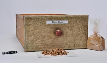 Schublade für Kräuterdrogen aus Nadelholz mit rotem Knauf. Vorderseite angeleimt, grau-braun maserierend angemalen. Die Schubladenseitenteile haben eine Schwalbenschwanzverbindung. Boden angeleimt und mit Holznägeln gesichert. Signatur mit Dymo-Band. Enthält Giftheil-Wurzel, als Ganzdroge und ein historisch beschriftetes Papiersäckchen.