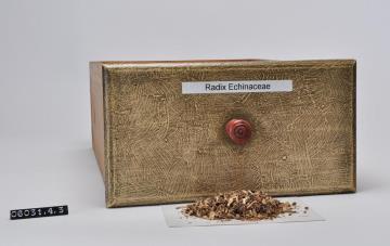 Schublade für Kräuterdrogen aus Nadelholz mit rotem Knauf. Vorderseite angeleimt, grau-braun maserierend angemalen. Die Schubladenseitenteile haben eine Schwalbenschwanzverbindung. Boden angeleimt und mit Holznägeln gesichert. Seitliches, gezahntes Preisschild für Ammonium chloratum purum. Signatur mit Dymo-Band. Enthält Sonnenhut-Wurzel, geschnitten (2003).