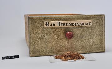 Schublade für Kräuterdrogen aus Nadelholz mit rotem Knauf. Vorderseite angeleimt, grau-braun maserierend angemalen. Die Schubladenseitenteile haben eine Schwalbenschwanzverbindung. Boden angeleimt und mit Holznägeln gesichert. Signatur auf aufgenageltem, händisch beschriftetem Blechschild. Enthält Schwalbenwurz geschnitten.