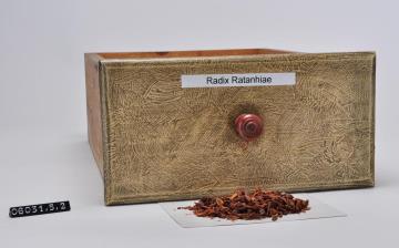 Schublade für Kräuterdrogen aus Nadelholz mit rotem Knauf. Vorderseite angeleimt, grau-braun maserierend angemalen. Die Schubladenseitenteile haben eine Schwalbenschwanzverbindung. Boden angeleimt und mit Holznägeln gesichert. Signatur mit Dymo-Band. Enthält Ratanhia Wurzel, Peru-Ratanhia, geschnitten.