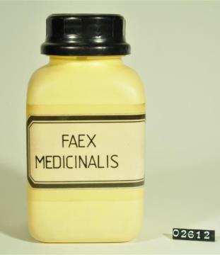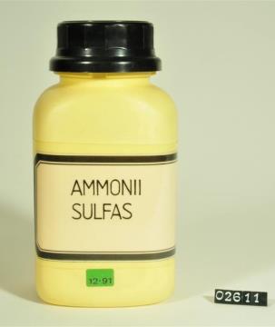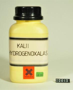 Gelbe Kunststoff-Vierkantflasche (Weithalsflasche) mit schwarzem Schraubverschluss. Mit schwarzen Abreibe Buchstaben auf weißem Grund beschriftetes und mit Klarsichtfolie überzogenes Papierschild, achteckig, mit schwarzem Doppelrand . Im Dezember 1991 aus dem Sortiment genommen (grünes Schild).