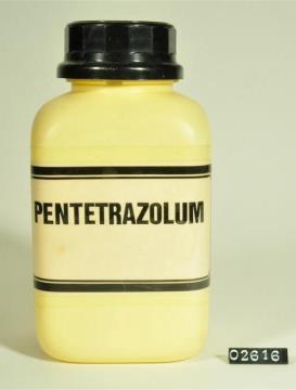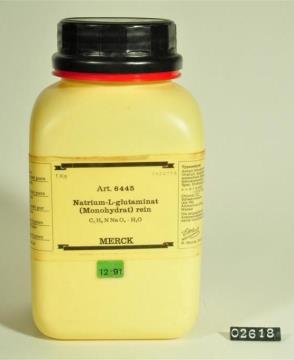 Gelbe Kunststoff-Vierkantflasche (Weithalsflasche) mit schwarzem Schraubverschluss. Etikettiert. Im Dezember 1991 aus dem Sortiment genommen (grünes Schild).