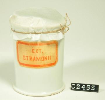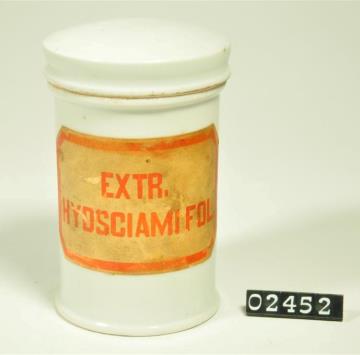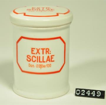 Zylinderförmiger Porzellantiegel mit Stülpdeckelrand, wenig ausladendem, schmalem, gerundetem Rand und Fuß. Flacher, zur Wand hin abgeschrägter Stülpdeckel mit kreuzförmiger Signatur mit Maximaldosenangabe. Standboden nach innen etwas eingezogen. Achteckiges, eingebranntes Schild, rot signiert.