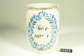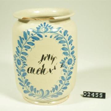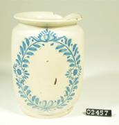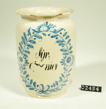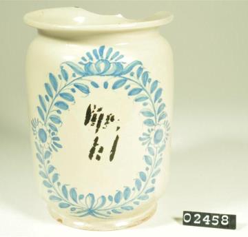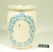 Zylinderförmiges Standgefäß mit abgesetztem Fuß, leicht eingezogenem Hals und ausgebogenem Rand. Kobaltblauer, ovaler Laubkranz, schwarze Signaturreste.