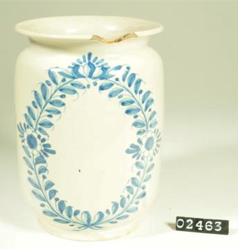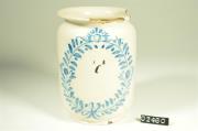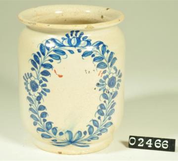Zylinderförmiges Standgefäß mit abgesetztem Fuß, leicht eingezogenem Hals und ausgebogenem Rand. Kobaltblauer, ovaler Laubkranz.