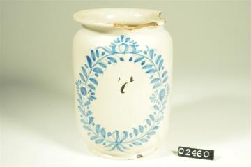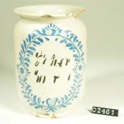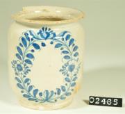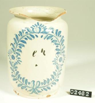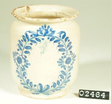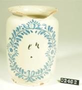 Zylinderförmiges Standgefäß mit abgesetztem Fuß, leicht eingezogenem Hals und ausgebogenem Rand. Kobaltblauer, ovaler Laubkranz. Rote und schwarze Signaturreste.