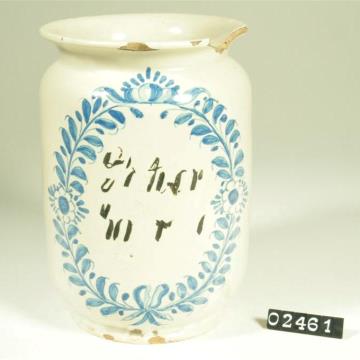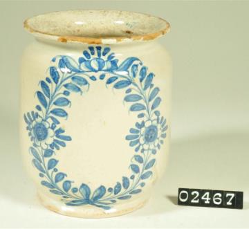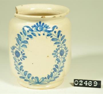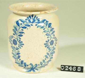 Zylinderförmiges Standgefäß mit abgesetztem Fuß, leicht eingezogenem Hals und ausgebogenem Rand. Kobaltblauer, ovaler Laubkranz. Schwarze Signaturreste.