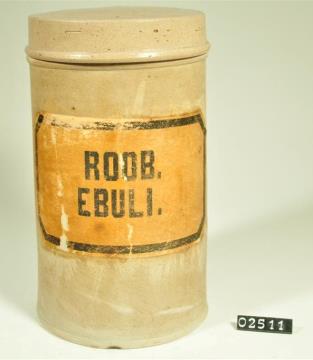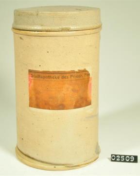 Zylinderförmiger Steinzeugtiegel mit Stülpdeckelrand, wenig ausladendem, schmalem Rand und Fuß. Flacher Stülpdeckel mit gerader Wand und zartem Rand. Standboden nach innen etwas eingezogen. Schwarz signiert. Enthielt das Mus der Beeren des Zwerg-Holunders (Sambucus ebulus L.) =Attichbeerenmus.