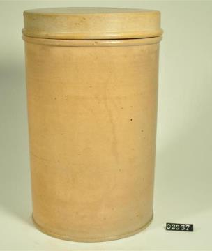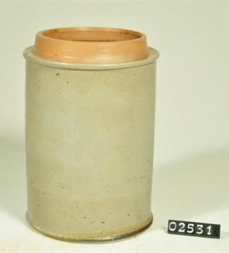 Zylinderförmiger Steinzeugtiegel mit Stülpdeckelrand, wenig ausladendem, schmalem Rand und Fuß. Standboden nach innen etwas eingezogen.