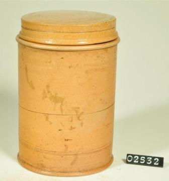 Zylinderförmiger Steinzeugtiegel mit Stülpdeckelrand, wenig ausladendem, schmalem Rand und Fuß. Flacher Stülpdeckel mit gerader Wand und zartem Rand. Standboden nach innen etwas eingezogen.