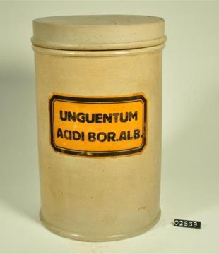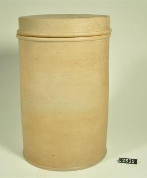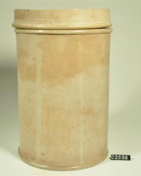Zylinderförmiger, vollständig glasierter Tiegel aus Keramik mit Tektur. Rille unter dem gerundeten Mündungsrand. Standboden nach innen etwas eingezogen. Mit unleserlichem Etikett.