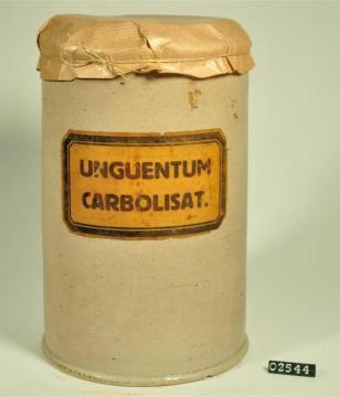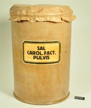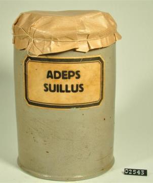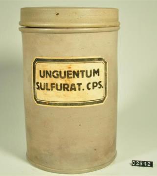 Zylinderförmiger Steinzeugtiegel mit Stülpdeckelrand, wenig ausladendem, schmalem Rand und Fuß. Flacher Stülpdeckel mit gerader Wand und zartem Rand. Standboden nach innen etwas eingezogen.