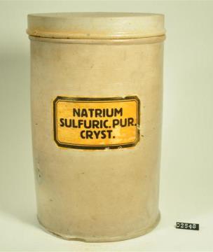 Zylinderförmiges Steinzeuggefäß mit eingezogener Schulter und Hals sowie verdickter, gerundeter Mündung. Standboden leicht aufgewölbt