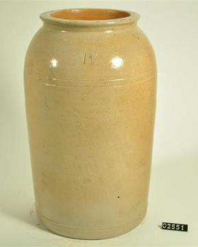 Zylinderförmiges Steinzeuggefäß mit eingezogener Schulter und Hals sowie verdickter, flacher Mündung. Zwei feine Rillen am Beginn der Schulter und eine in Bodennähe. Standboden plan