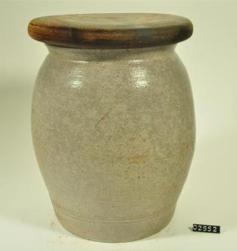 Bauchiges Steinzeuggefäß mit ausgestelltem Rand und flachem Holzdeckel. Zwei feine Rillen in Bodennähe. Standboden plan