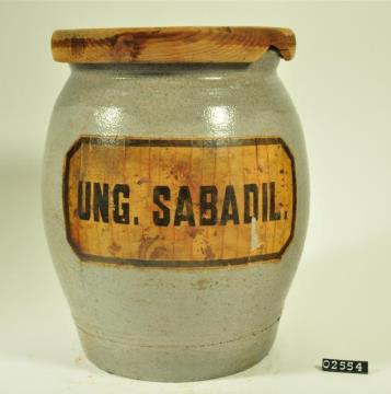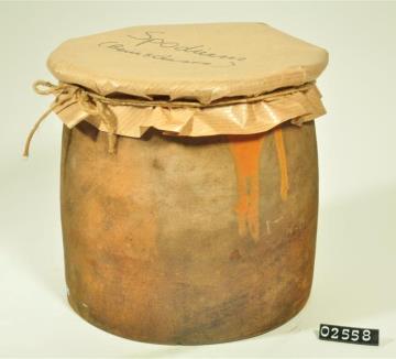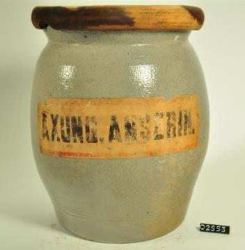 Gebauchte Topfform aus Keramik (Steingut) mit eingezogener Schulter und Hals sowie nach außen gerundeter Mündung. Dünner, flacher Holzdeckel mit Steckzarge. Bauch an vier Seiten abgeflacht. Kleiner Wulst am Bodenrand. Standboden plan. Enthält Hammeltalg.
