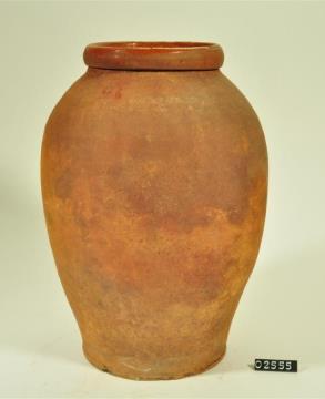 Gebauchter Topf aus Keramik mit eingezogener Schulter und Hals, nach außen gerundeter Mündung. Kleiner Wulst am Bodenrand. Standboden plan