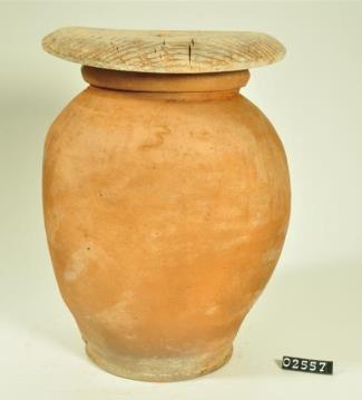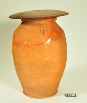Gebauchter Topf aus Keramik (Steingut) mit eingezogener Schulter und Hals sowie nach außen gerundeter Mündung. Dünner, leicht gewölbter Holzdeckel mit Steckzarge. Bauch an vier Seiten abgeflacht. Kleiner Wulst am Bodenrand. Standboden plan