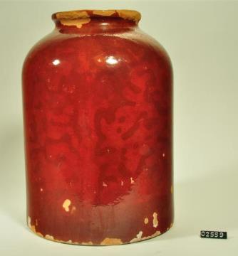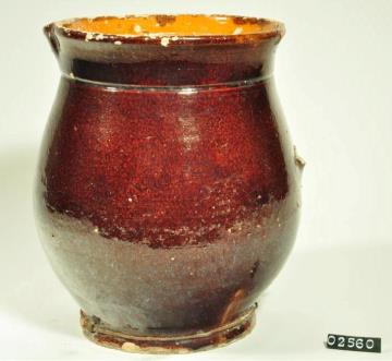 Zylinderförmiger Topf aus Keramik mit eingezogener Schulter und ausgebogener Mündung. Braun Glasiert, teilweise abgesprungen. Standboden leicht aufgewölbt