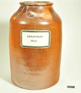 Zylinderförmiger, außen rotbraun und innen hellbraun glasierter Doppelhenkeltopf mit randständigen, im Querschnitt bandartigen Henkeln. Leicht eingezogene Schulter und profilierter Rand. Gewölbter und oben abgeflachter Einlegedeckel mit massivem, zentralen Knauf. Rille am Bodenrand. Standboden unglasiert und leicht aufgewölbt