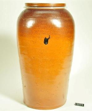 Zylinderförmiges Steinzeugtopf mit Salzglasur und konisch zulaufender Schulter zum gerundeten, verstärkten Mündungsrand. Standboden unglasiert und leicht aufgewölbt. Schwarz signiert