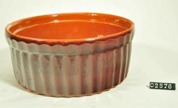 Nahezu zylinderförmige, außen braun und innen rotbraun glasierte Backform (Braungeschirr) mit abgesetztem Rand und Rippen in der steilen Wandung. Standboden unglasiert und nahezu plan.