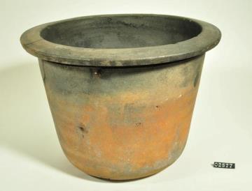 Konischer Graphittopf mit ausladendem, nach außen abgeschrägtem Rand und Kugelboden mit nahezu planer Standfläche. Unter der Mündung mit Eisendraht verstärkt.