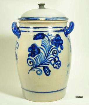 Bauchiger Doppelhenkeltopf mit horizontal aufgesetzten, aufgebogenen Wulsthenkeln. Vollständig salzglasiertes, hellgraues Steinzeug mit blauem Blüten- und Blattdekor, Henkeln und Rillen. Verstärkter Mündungsrand mit gewölbtem Hohldeckel mit Steckzarge, sowie massivem, zentralen, anthrazitgrauem Knauf. Standboden leicht aufgewölbt. Etikettiert