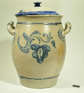 Bauchiger Doppelhenkeltopf mit horizontal aufgesetzten, aufgebogenen Wulsthenkeln. Vollständig salzglasiertes, hellgraues Steinzeug mit graublauem Blüten- und Blattdekor und Rillen. Verstärkter Mündungsrand mit gewölbtem Hohldeckel mit Steckzarge, sowie massivem, zentralen, blauen Knauf. Standboden leicht aufgewölbt.
