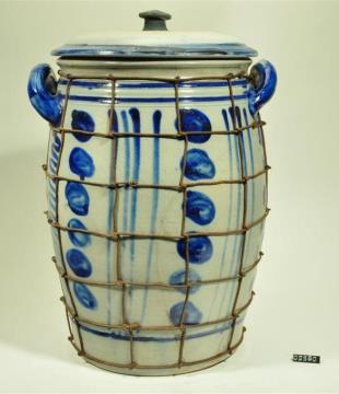 Bauchiger Doppelhenkeltopf mit horizontal aufgesetzten, aufgebogenen Wulsthenkeln. Vollständig salzglasiertes, hellgraues Steinzeug mit blauem geometrischem Dekor, blauen Henkeln und Rillen. Verstärkter Mündungsrand mit gewölbtem Hohldeckel mit Steckzarge, sowie massivem, zentralen, anthrazitgrauem Knauf. Standboden leicht aufgewölbt. Mit Eisendrahttgitter vollständig ummantelt.