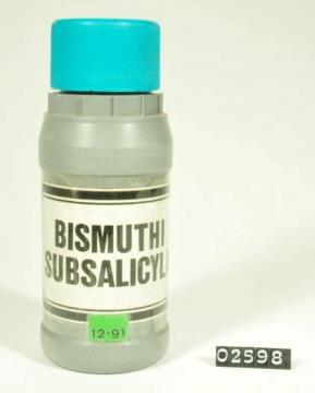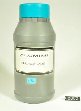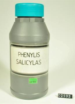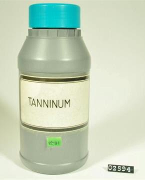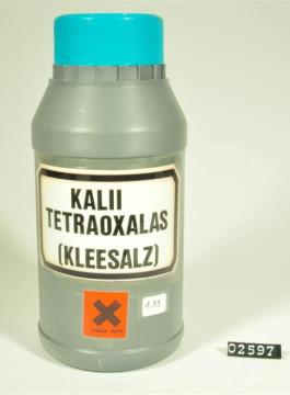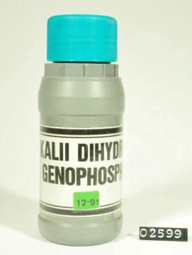 Runde, graue Weithalsflasche aus Kunststoff mit grünem Schraubverschluss, darunter Zackenrand. Schwarz signiert