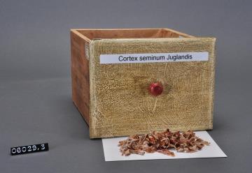 Schublade aus Nadelholz mit rotem Knauf und gezinkten Verbindungen (Schwalbenschwanzverbindung). Boden angeleimt und mit Holznägeln gesichert. Vorderfront auch aufgeleimt, maserierend grau-braun gestrichen. Innenseite der Schublade mit braunem Papier ausgekleidet. Seitlich altes Preischild für Fruct. Anisi vulg.. Signatur: schwarz beschriftetes Dymoband auf weißem Grund. Enthält die Samenhäutchen der Echten Walnuß.