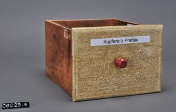 Schublade aus Nadelholz mit rotem Knauf und gezinkten Verbindungen (Schwalbenschwanzverbindung). Boden angeleimt und mit Holznägeln gesichert. Vorderfront auch aufgeleimt, maserierend grau-braun gestrichen. Seitlichg altes Preischild für Emplastrum Galbani. Signatur: schwarz beschriftetes Dymoband auf weißem Grund. Enthält Kupfererz mit historischer Beschreibung: Kupfererzstufen von Prettau, 21.September 1855.