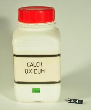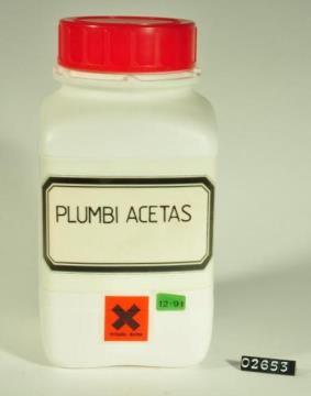 Weißer, im Grundriss quadratischer Niederdruckpolyethylenbehälter mit rotem Schraubverschluss aus Polypropylen. Schwarz signiert