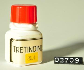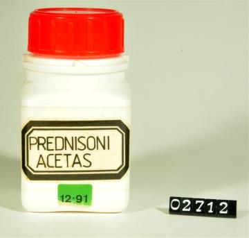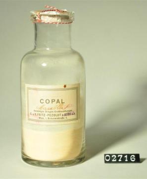 Rundes, farbloses Pulverglas mit Stopfen (Korkstopfen). Leicht hochgestochener Boden mit Hefteisenabriss und umgelegtem Faden beim Mündungsrand. Etikettiert
