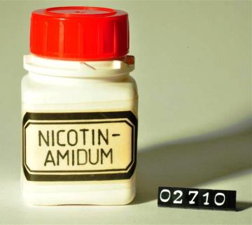 Rundes, farbloses Pulverglas mit Stopfen (Korkstopfen). Hochgestochener Boden mit Hefteisenabriss und verstärktem Mündungsrand. Etikettiert