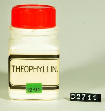 Rundes, farbloses Pulverglas mit Stopfen (Korkstopfen). Leicht hochgestochener Boden mit Hefteisenabriss und flachem, ausladeneden Mündungsrand. Etikettiert