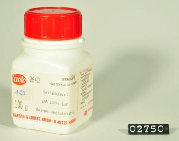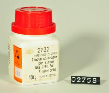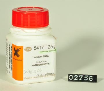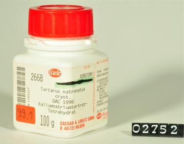 Weiße Kunststoff-Vierkantflasche (Weithalsflasche) mit rotem Schraubverschluss. Originaletikett der Firma Caelo. Seitlich rotes Inventur-Etikett vom 1999. Enthält Kupfersulfat.