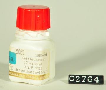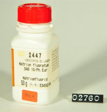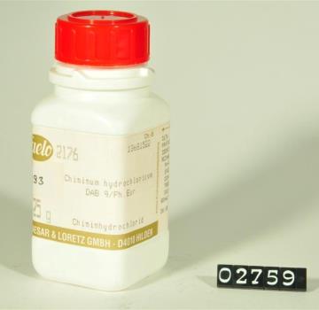 Weiße Kunststoff-Vierkantflasche (Weithalsflasche) aus Polyethylen mit rotem Schraubverschluss. Quadratischer Boden. Verpackt in braunroter Medikamentenschachtel. Etikettiert. Mit Analysenzertifikat vom 08.02.1999. Enthält Thiaminchlorid = Vitamin B1