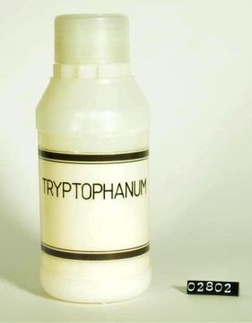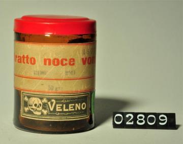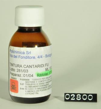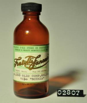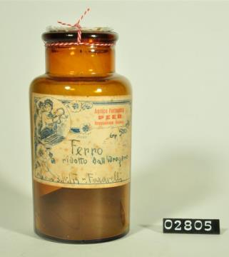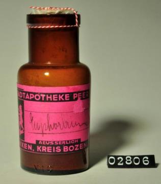 Runde, braune Weithalsflasche mit Korkstopfen. Verstärkter, flacher Mündungsrand. Etikettiert